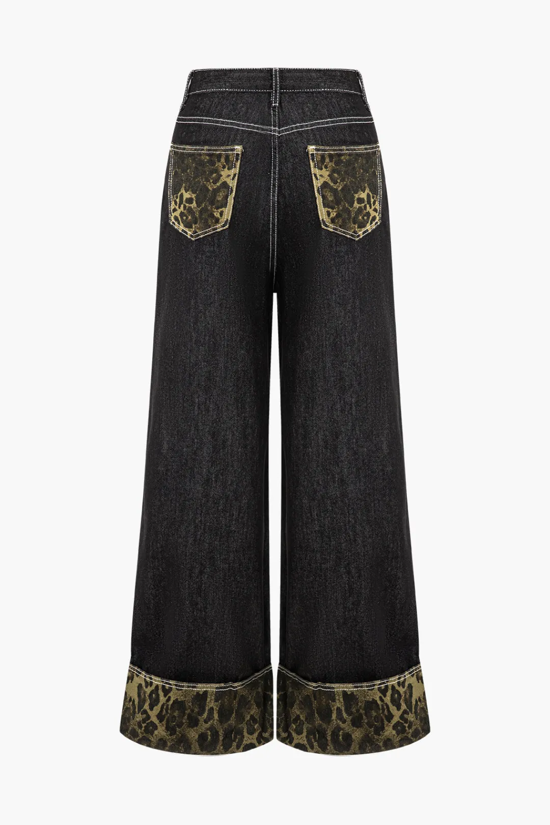 MICAS Jeans-Leopard Print Denim Patchwork Straight Leg Jeans BLACK