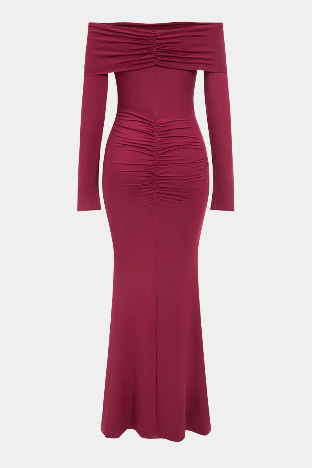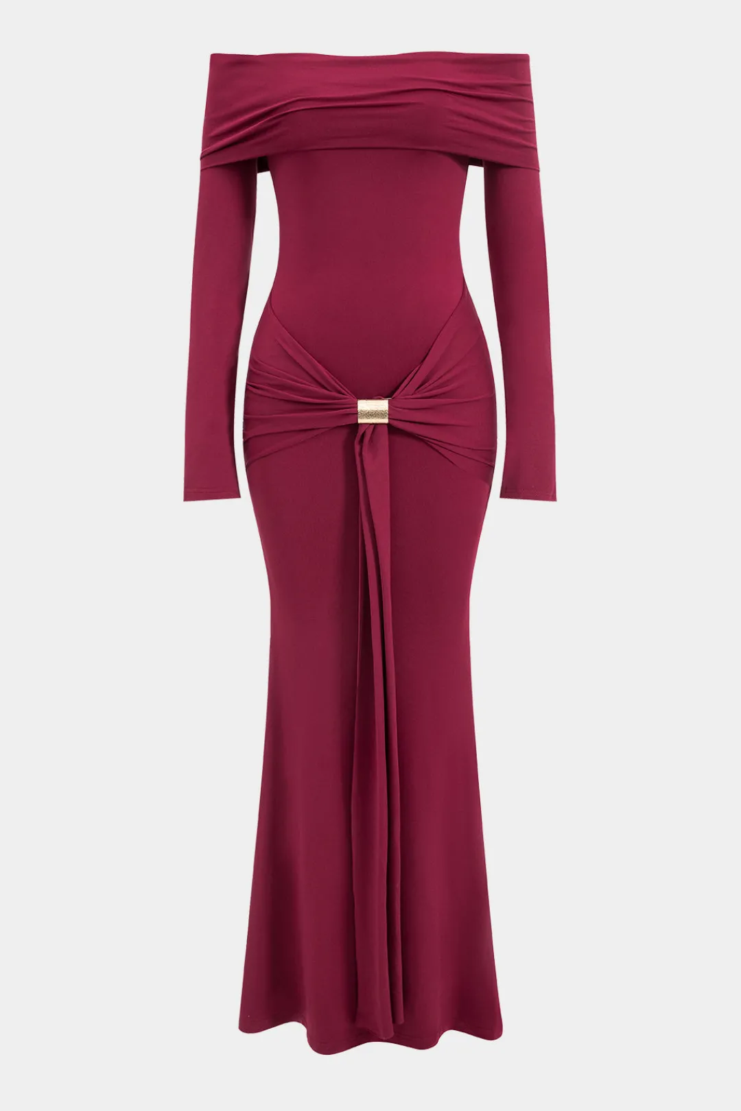 MICAS Long Sleeve Dresses|Maxi Dresses-Metallic Detail Off Shoulder Long Sleeve Maxi Dress BURGUNDY