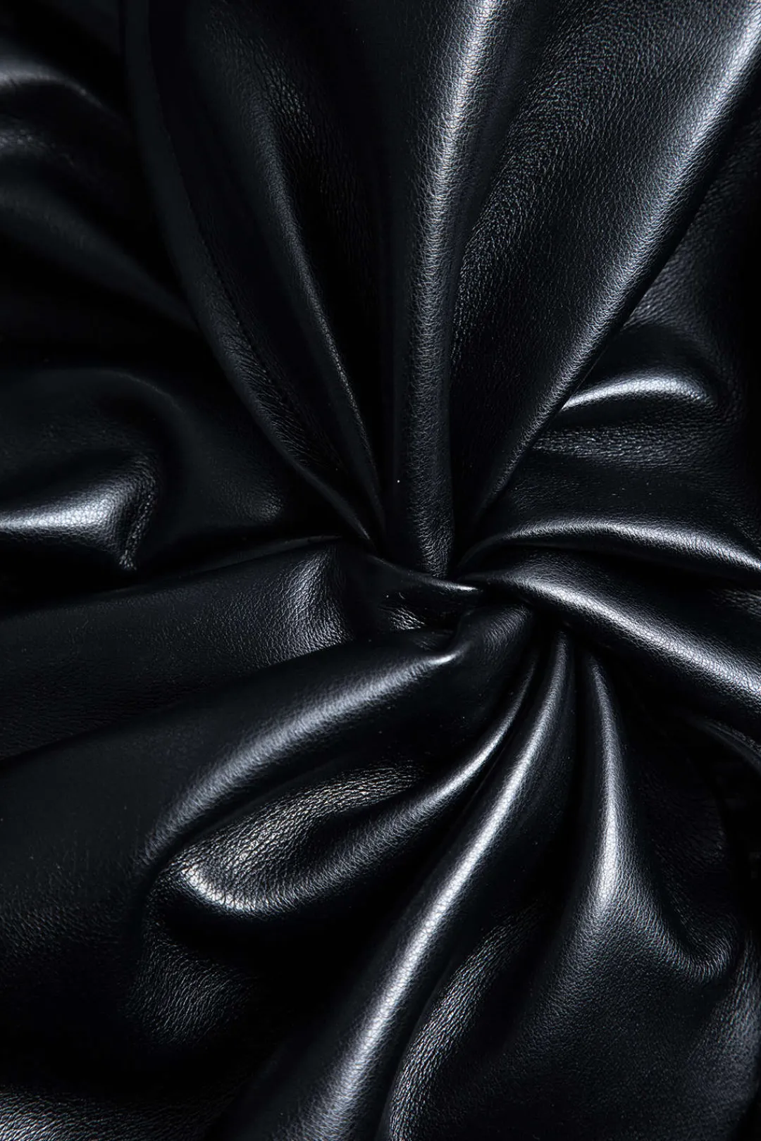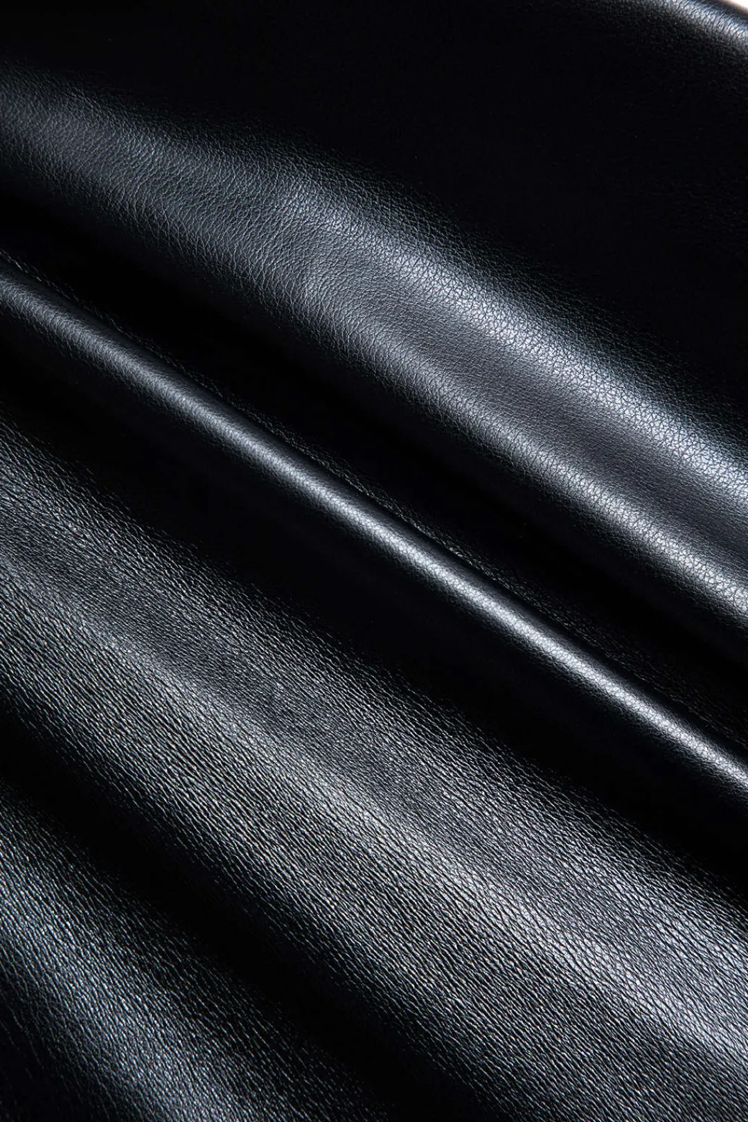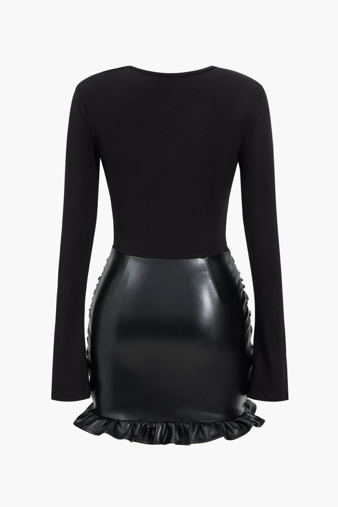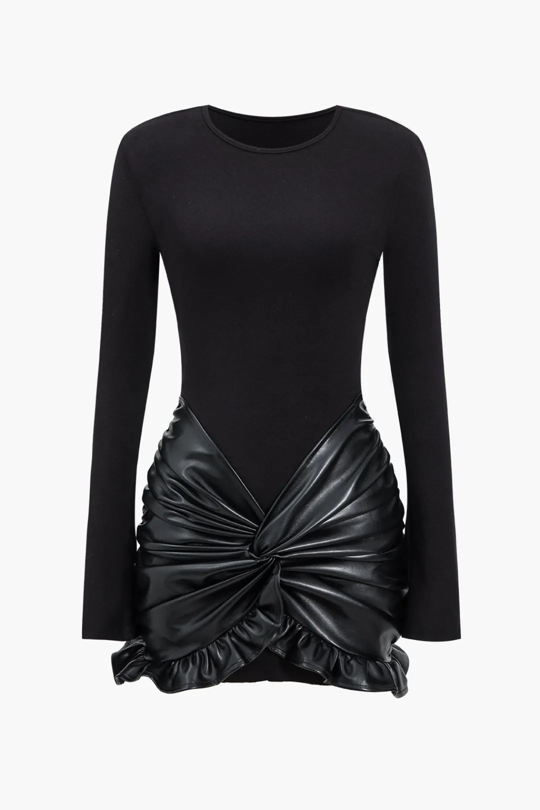 MICAS Long Sleeve Dresses|Mini Dresses-Faux Leather Patchwork Ruffle Ruched Long Sleeve Mini Dress BLACK